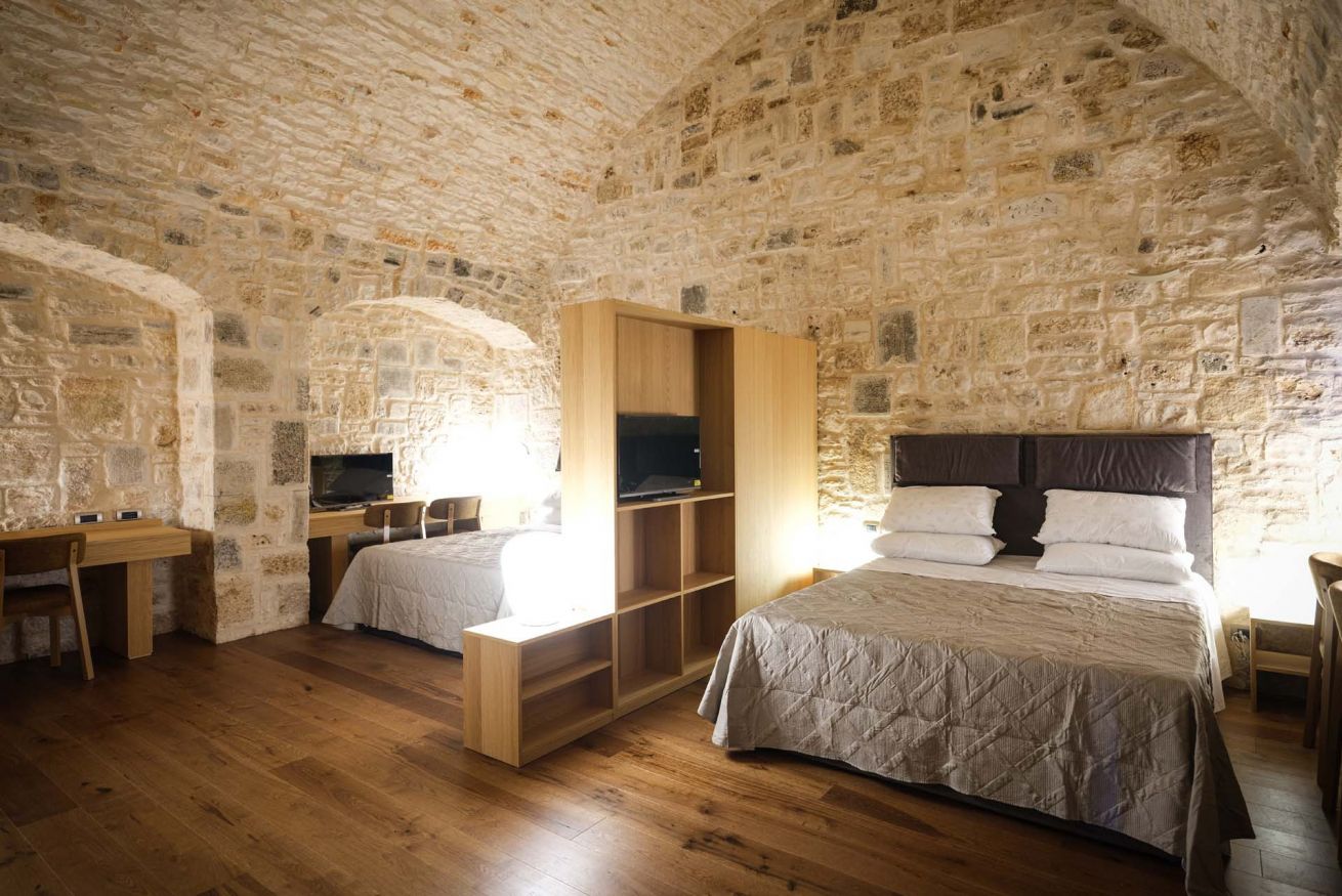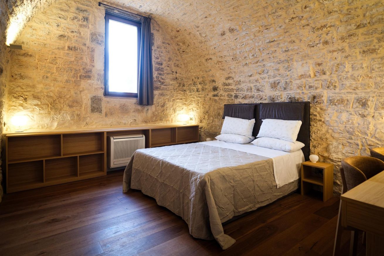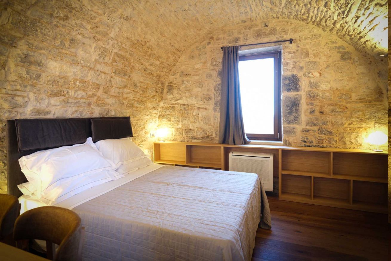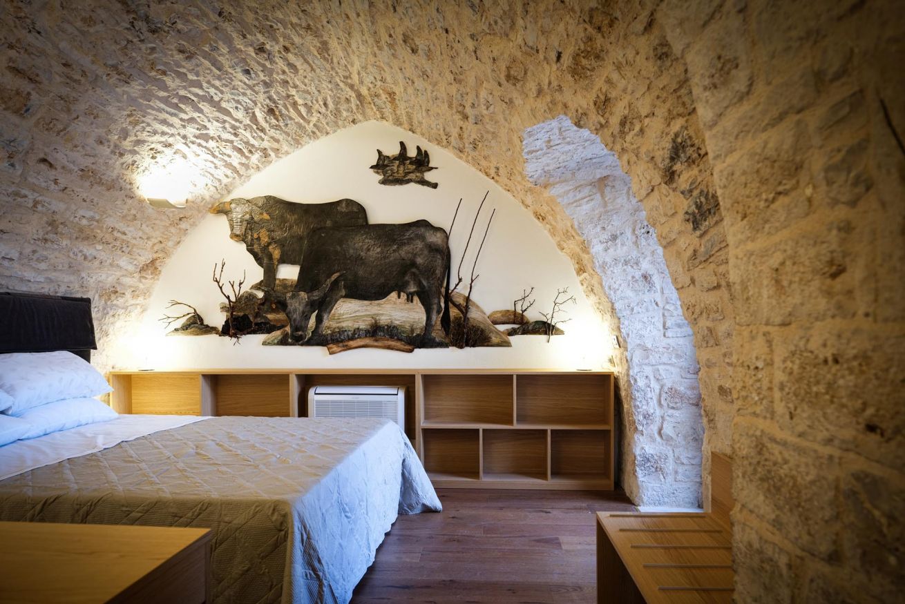 Le suite, ricavate da un autentico jazzo murgiano con pareti in pietra a vista, accolgono fino a 4 persone in un ambiente che coniuga storia e comfort moderno. Sono disponibili in due tipologie: una soluzione open space con due letti matrimoniali in un unico ambiente, oppure una versione con due camere separate senza porta divisoria, ciascuna dotata di letto matrimoniale.