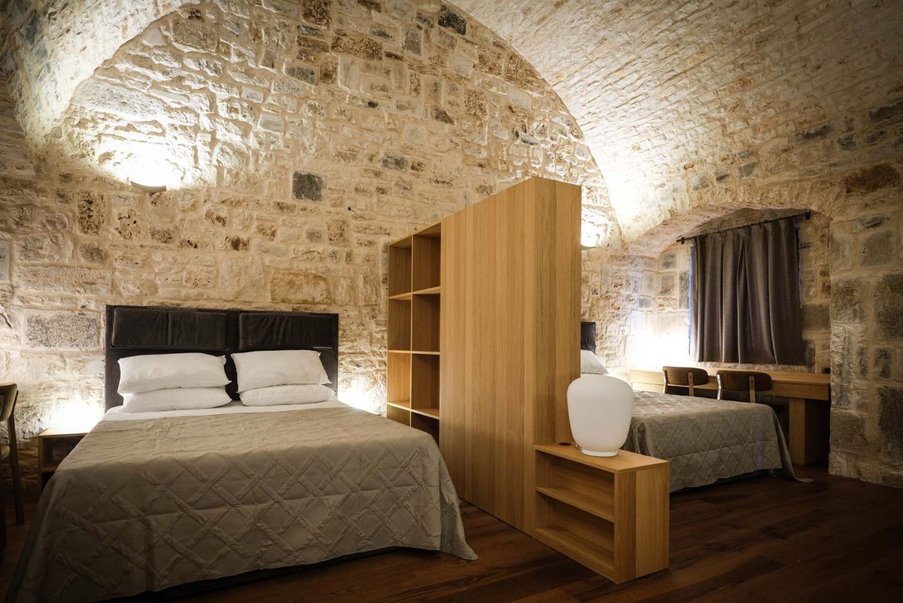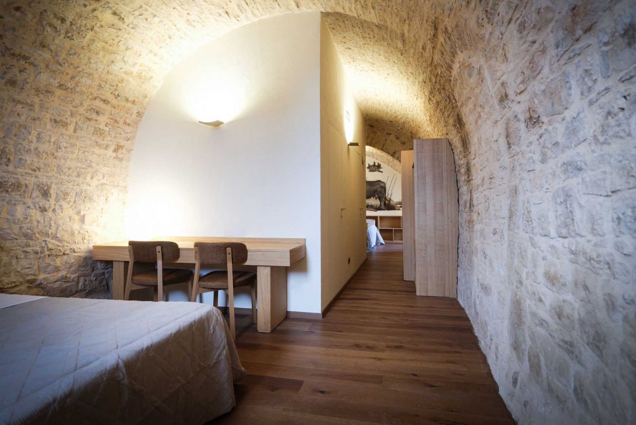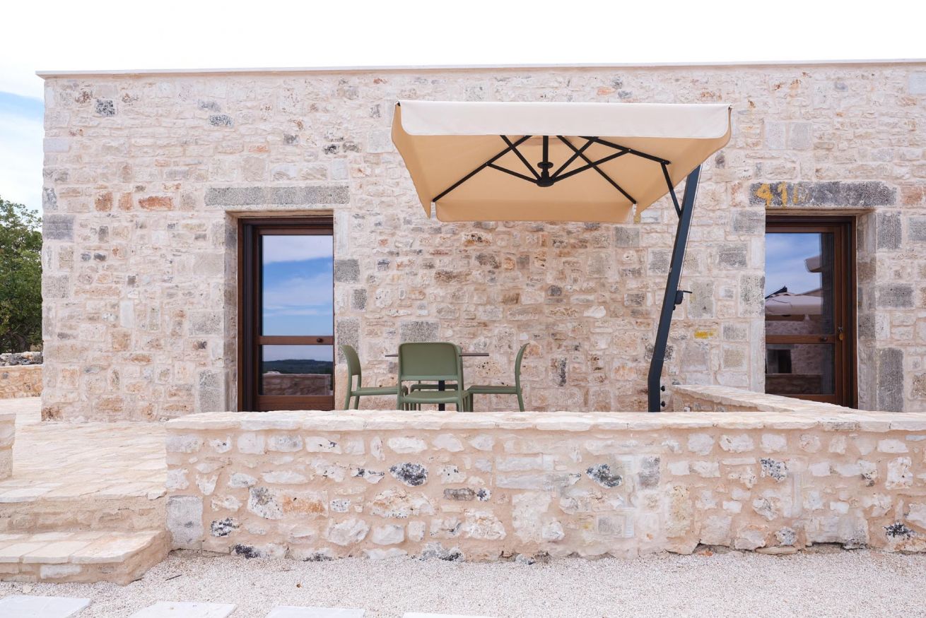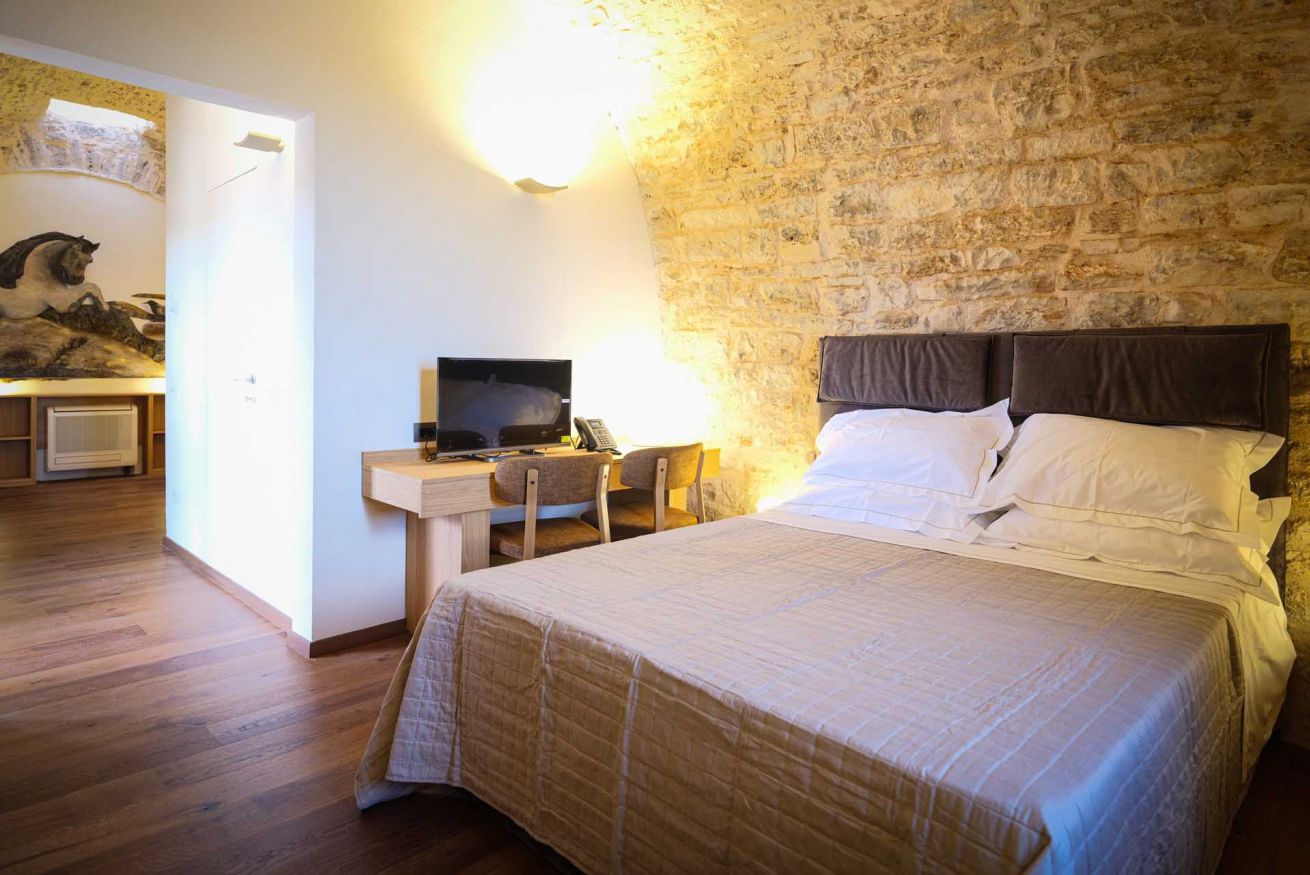Le suite, ricavate da un autentico jazzo murgiano con pareti in pietra a vista, accolgono fino a 4 persone in un ambiente che coniuga storia e comfort moderno. Sono disponibili in due tipologie: una soluzione open space con due letti matrimoniali in un unico ambiente, oppure una versione con due camere separate senza porta divisoria, ciascuna dotata di letto matrimoniale.